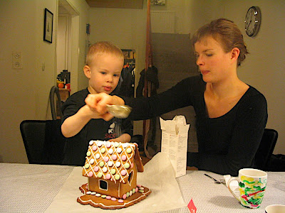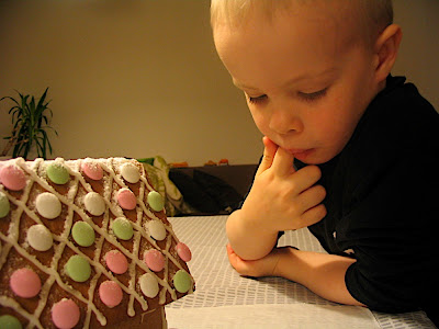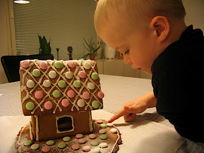 Jouluvalmistelut jäivät tänä vuonna melko vähälle, koska matkustimme jouluksi Mikkeliin. Piparkakkutalo tehtiin kuitenkin pitkän kaavan mukaan. Itsenäisyyspäivänä alotettiin ja paistettiin kantavat seinät. Seuraavan viikon ajan _joka päivä_ neuvoteltiin siitä, saako seiniä syödä. Äiti ei antanut koskea seiniin, mutta savupiipunpa söin! Sitten ostettiin yhdet koristelukarkit, jotka hävisivät ennen kuin kerkesivät taloon (tästä ei neuvoteltu). Sitten liimattiin osat yhteen ja annettiin kiinnittyä. Neuvoteltiin, saako talon syödä. Sitten lopulta parin viikon jälkeen planeetat olivat oikeassa asennossa, seinät pystyssä ja karkit katossa. Lopuksi siroteltiin tomusokeria lumeksi ja talo oli valmis! Jatkettiin neuvotteluja…