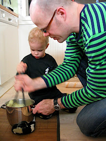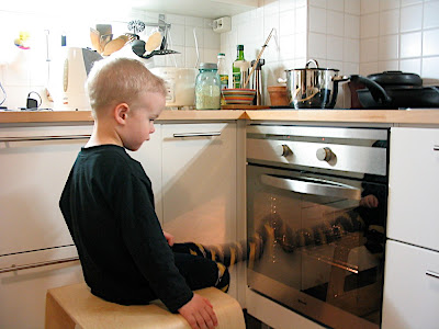 Silakkapihvien teossa on joka kerta jotain harrasta. Tässä patseeraan jakkaralla ja odotan, että uunin merkkivalo sammuu, jolloin pihvit saadaan uuniin. Alla töötään muussia isin kanssa. Olen kerta kerralta innokkaampi piffittelijä. Viime kerralla äitin hästäys alkoi jo häiritä. Olisin halunnut tehdä KAIKEN itse.