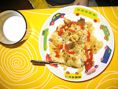 Tämä on lempiruokani, siksi kuvasin sen teille. Ketsupilla taiteillaan aina annokseen kuu ja tähdet, näettehän. Muita lempiruokiani ovat silakka, lohi kaikissa muodoissa – paitsi graavattuna, oikeastaan kaikki kalat, lihapullat, riisipuuro, isin banaanijugurtti, jauhelihakeitto ja maksalaatikko. Ainaskin. Olen kasvanut muuten syksyn aikana 4 senttiä pituutta. Olen noin sataviis senttiä pitkä.
