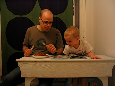 Äiti on vihdoin saanut pulpettini valmiiksi! Hyvä äiti, meni vain kuusi kuukautta (-kaksi kuukautta takapihalla vesisateessa, 3 päivää hiekkapuhaltamossa ja 3 kuukautta ja 29 päivää kellarissa). Isin kanssa testattiin pulpetti käytössä, isi söi makkaraa ja minä luin sille iltasatulukemiseksi kirjaa. Hyvin toimi!