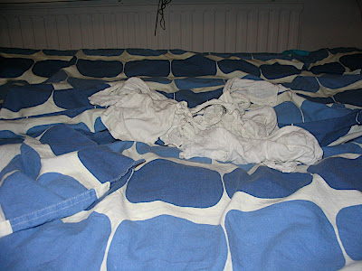 Tämä mytty on unipaita, joka nasun ohella seuraa minua jokaiseen paikkaan missä täytyy yöpyä. (”Saanko minäkin näppäillä välillä, äiti? äiti? ÄITI?” 7i879i8pl09ptyh5) Takaisin unipaitaan… tämä on siis äidin vanha puuvillainen paita, joka on maailman pehmein ja ohuin ja ihanin. Sen kun laittaa poskea vasten, alkaa väsyttää vaikka olisi mikä juttu kesken. Uikki alkaa valitettavasti vedellä viimeisiään. Sitä on ommeltu useampaan kertaan kokoon, mutta silti se muistuttaa näinä päivinä lähinnä pitkulan mallista retaletta. Se on niin hauras, ettei se kestä enää yhtään konepesua saatikka sitten linkousta. Iltaisin kun osa siitä on jäänyt mahan alle jumiin, niin se ratkeaa joka kerta kun kiskaisen sitä paremmin poskea vasten. Onneksi hoksasin ottaa siitä kuvan kun se vielä on olemassa! (Eli kuva: Eeli Palokangas)
