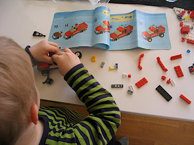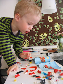 Olen siirtynyt isoista legoista pienempiin. Innostus lähti aura-autosta ja harja-autosta, jotka äiti toi tuliaiseksi keväällä Kuopiosta. Legojen mukana tulee luonnollisesti ohjekirjat, joita seuraamalla rakentaminen sujuu. Äiti ajatteli ensiksi että selailen ohjeita vain satunnaisesti, mutta nyt hänkin on huomannut, että todellakin seuraan ohjeita ja rakennan niiden mukaan. Myös piirrustustaitoni ovat harjaantuneet mukavasti. Viimeisin yksityiskohta on korvat, jotka ovat kehittyneet pään sivuilla olevista viivoista lerpakkeisiin, joissa on jopa korvakäytävät.