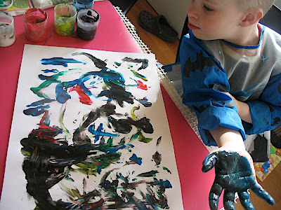 Joissain taideteoksissani kysytään hahmottamiskykyä. Varsinkin sormiväreillä tehdyt tuotokset lähestyvät projektiivista laatua jo lähes tieteellisellä tasolla. Tässä kuvassa on kilpikonna, joka yrittää hätistää pois lentokonetta, joka on pudonnut vesiputoukseen. Äitillä on vaikeuksia nähdä tätä sisältöä – tai sitten se ei vaan kehtaa myöntää.