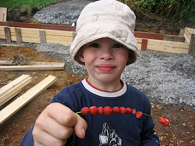 Metsämansikoita. Kissakoskella oli joka puolella metsämansikoita. Äiti neuvoi tekemään niistä tällaisen helminauhan. Isi sitten kyllä söi sen, koska minun mielestä mansikat on väkeviä.