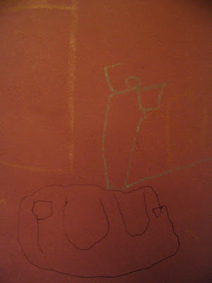 Tässä on kuva torvesta. Ja siinä lukee, että TORVI. Isi kysyi, että miksi piirsin torven. Sanoin, että se on yllätys. Tietenki.