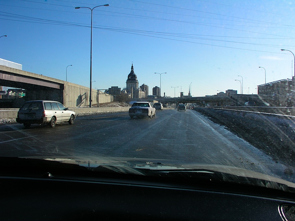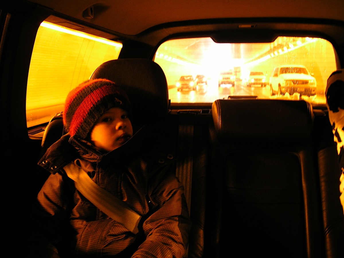 Amerikassa on melkein pakko olla auto. Kaikki paikat on tosi kaukana. Meidänkin kerho, Suomi-koulu, neuvola ja äitin lankakauppa ja muut ovat kaikki ainakin kahdenkymmenen kilometrin päässä (ja me asumme kaupunkialueella). Pyörällä ei voi kulkea niin kuin Oulussa, kun ei ole pyöräteitä. Ja bussilla ei pääse joka paikkaan (ainakaan saman vuorokauden aikana, toim. huom. Vaikka Minneapolisissa onkin amerikkalaisittain varsin edistynyt bussiverkosto). Näissä kuvissa ollaan menossa St. Pauliin ostamaan jääkiekkolippuja, jotta isi ja pappa pääsevät ensi viikolla katsomaan NHL:ää.