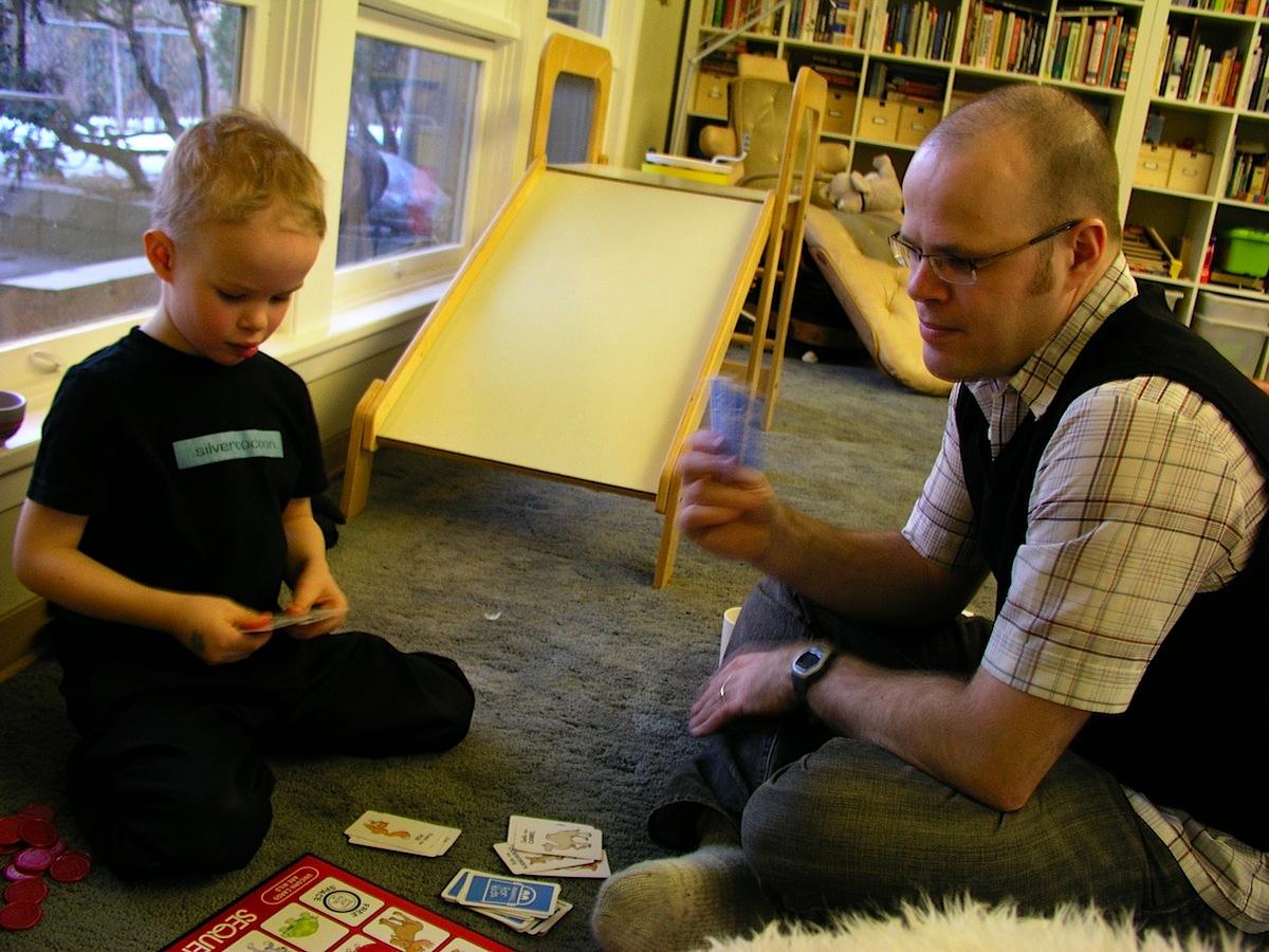 Osaan nykyisin pelata montaa peliä. En osaa pelkästään sääntöjä vaan myös taktiikkaa ja strategiaa. Minulla saattaa olla ”hyvät kortit voittamiseen” tai sitten voin ”estää sua voittamasta”. Isi ja äiti saa pelata jo ihan tosissaan, jos aikovat pärjätä. Pelaisin mielelläni pelejä aamusta iltaan. Dominoa, muistipelejä, palapelejä, loogisia päättelypelejä, puuhakirjojen pelejä, lasten tietokonepelejä. Tässä me pelataan isin kanssa lasten Sequence-nimistä peliä. Siinä pitää saada neljä pylpyrää pystyyn, vaakaan tai vinottain. Isi ei oikein pärjää.