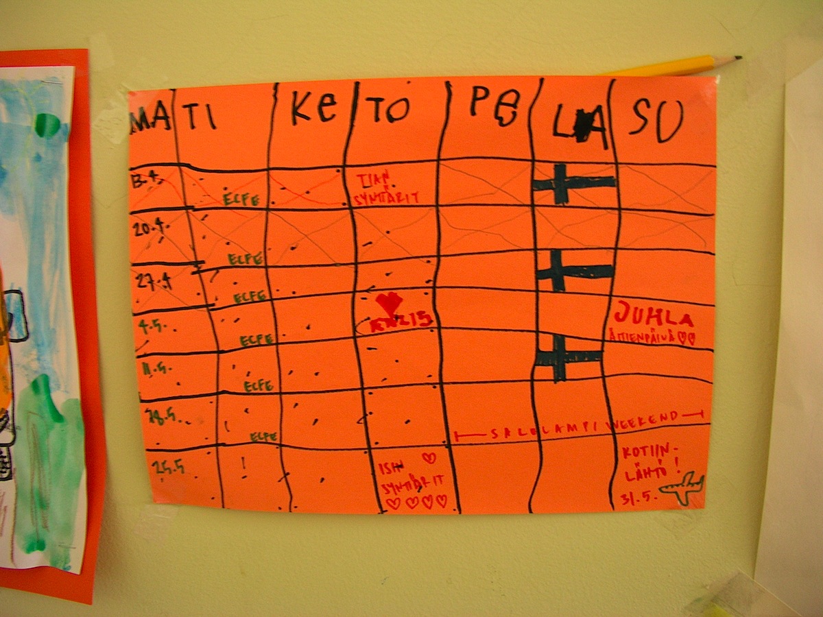 Viimeisen kalenterin on tehnyt Eeli itse. Kuten siitä on luettavissa, meillä ei ole enää kovin montaa viikkoa. Kaksi Suomikoulupäivää, kahdet synttärit, yhdet juhlat ja pari reissua. Englantikoulu ja tiistaikerhokin loppuvat toukokuun lopussa. Meillä on Eelin kanssa jo aikamoinen polte kotiin. Isillä vaan on vielä paljon hommaa.