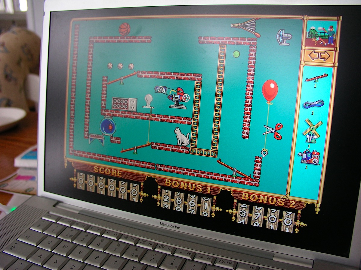 Meillä on pelattu pari viikkoa joka päivä the incredible machine-peliä. Sitä pelataan niin, että täytyy kaikkia vempaimia käyttämällä saada aina joku asia tapahtumaan. Tässä kolme pesäpalloa täytyy saada tikapuukuiluun.