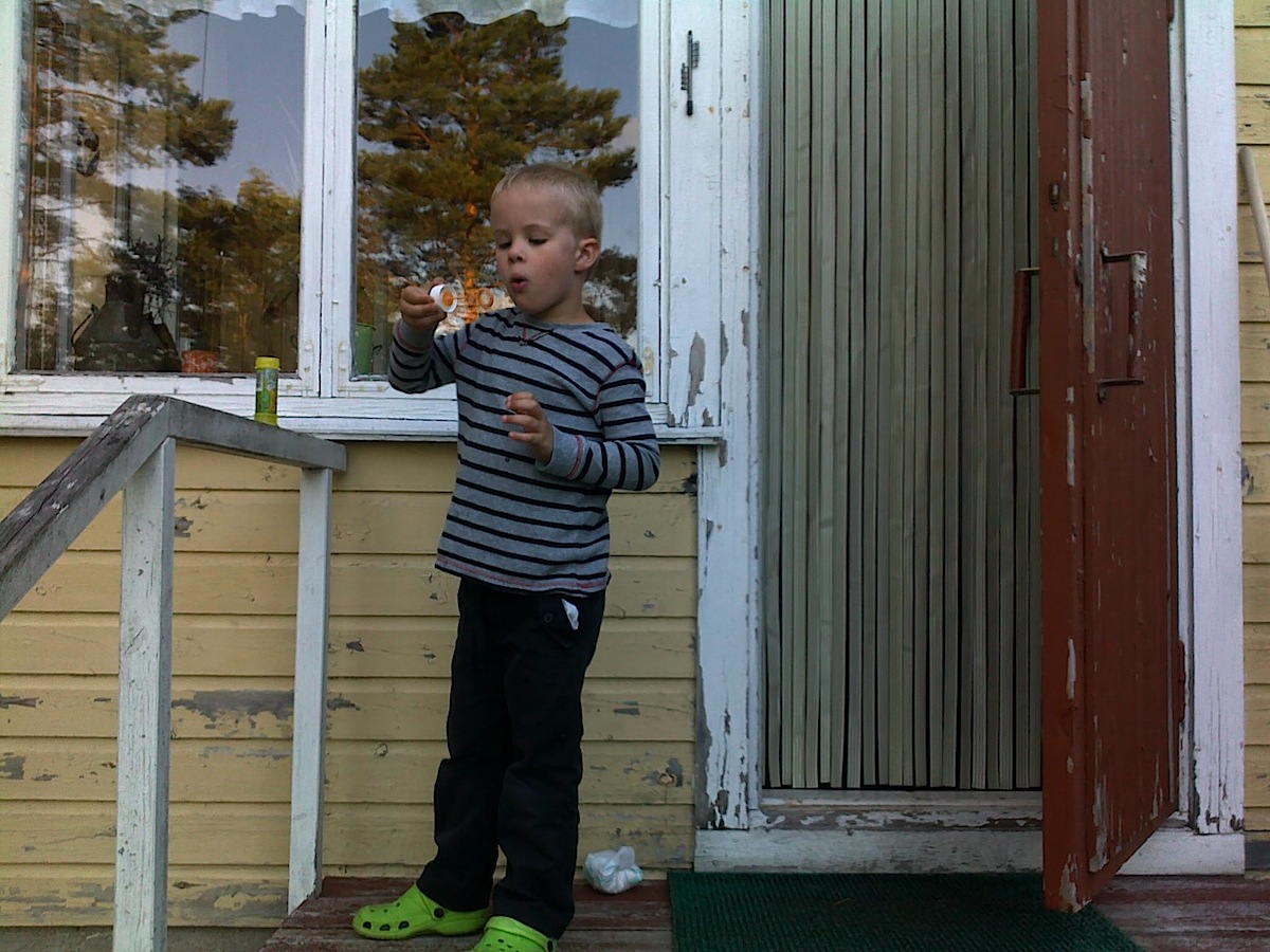 Vietettiin viikonloppua mökillä. Kahteen päivään mahtui paljon hommaa. Puhallettiin saippuakuplia mökin portailla: (We spent last weekend in the summer cabin in Ahmas. There’s plenty of activities that fit in two days. We made bubbles on the porch:)