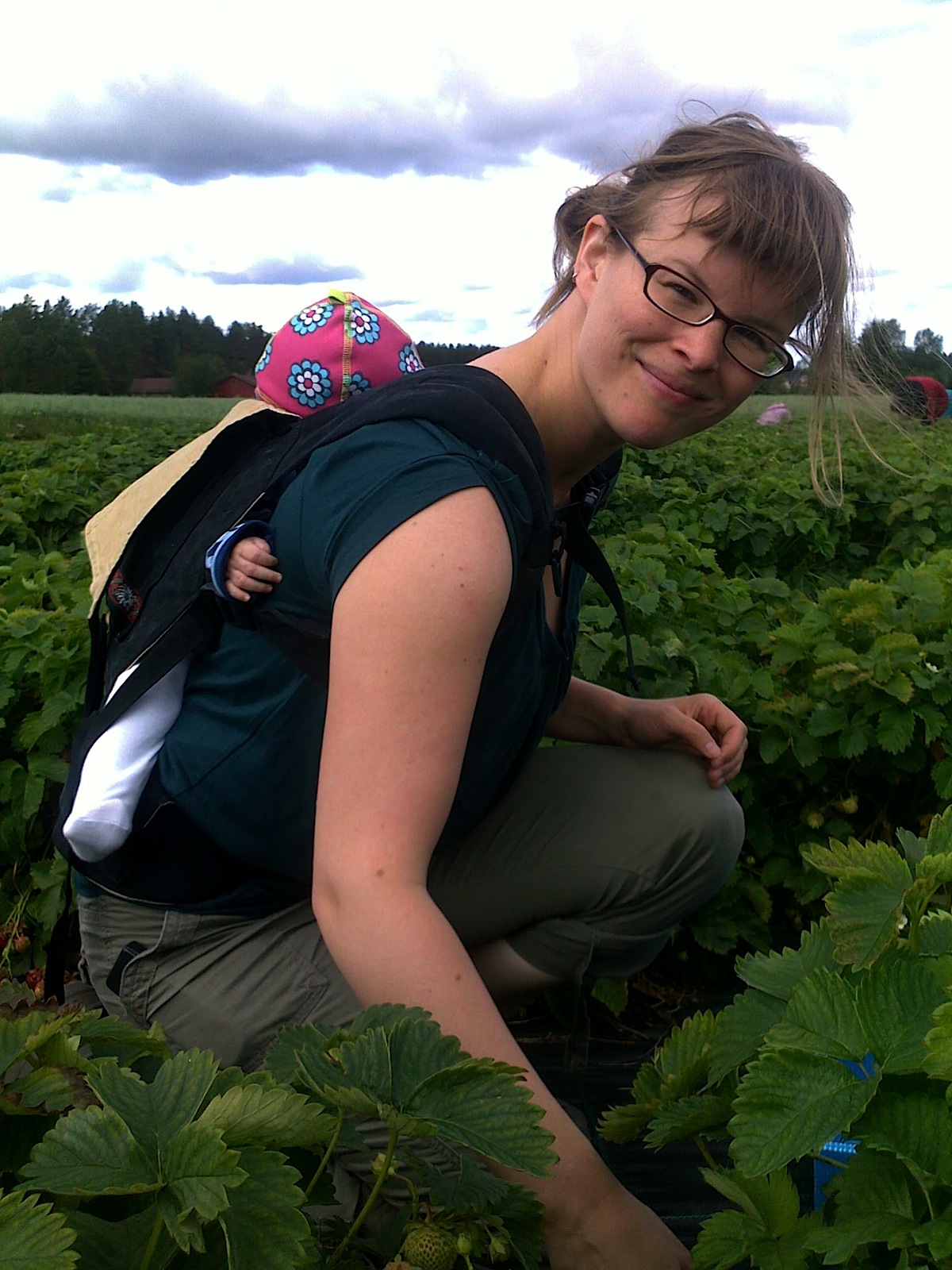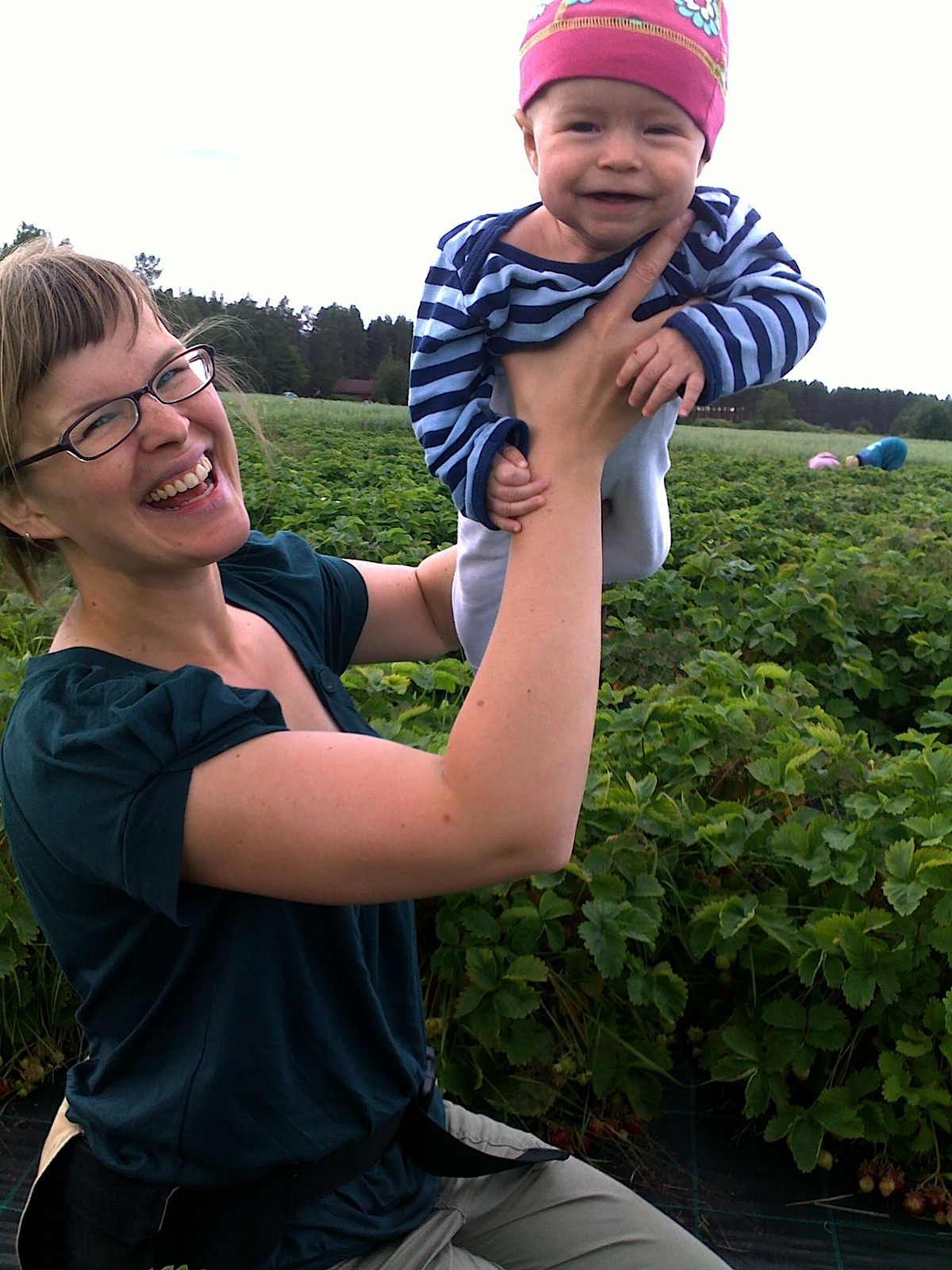 Ja isi ja äiti kävi Sillan kanssa keräämässä kuusi kiloa mansikoita: (And daddy and mommy and Silla picked up about 12 pounds of strawberries in a nearby strawberry farm:)