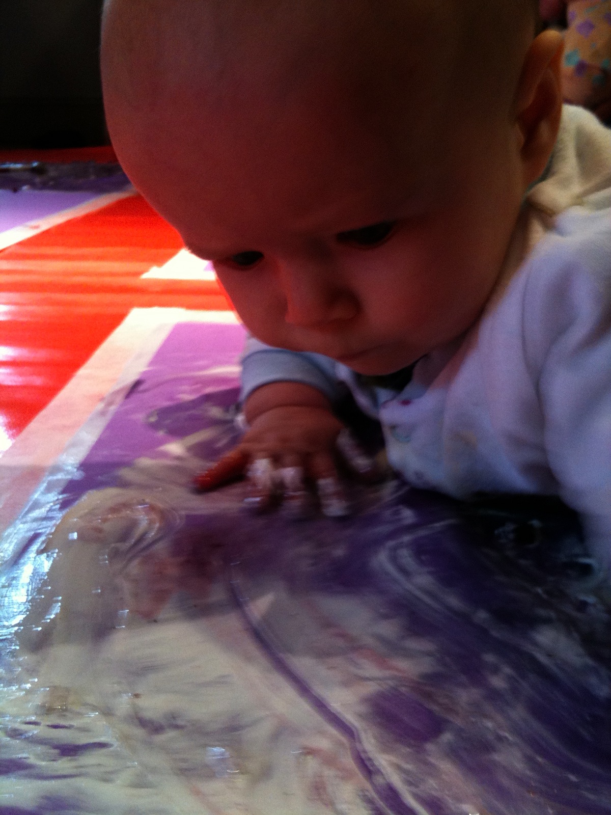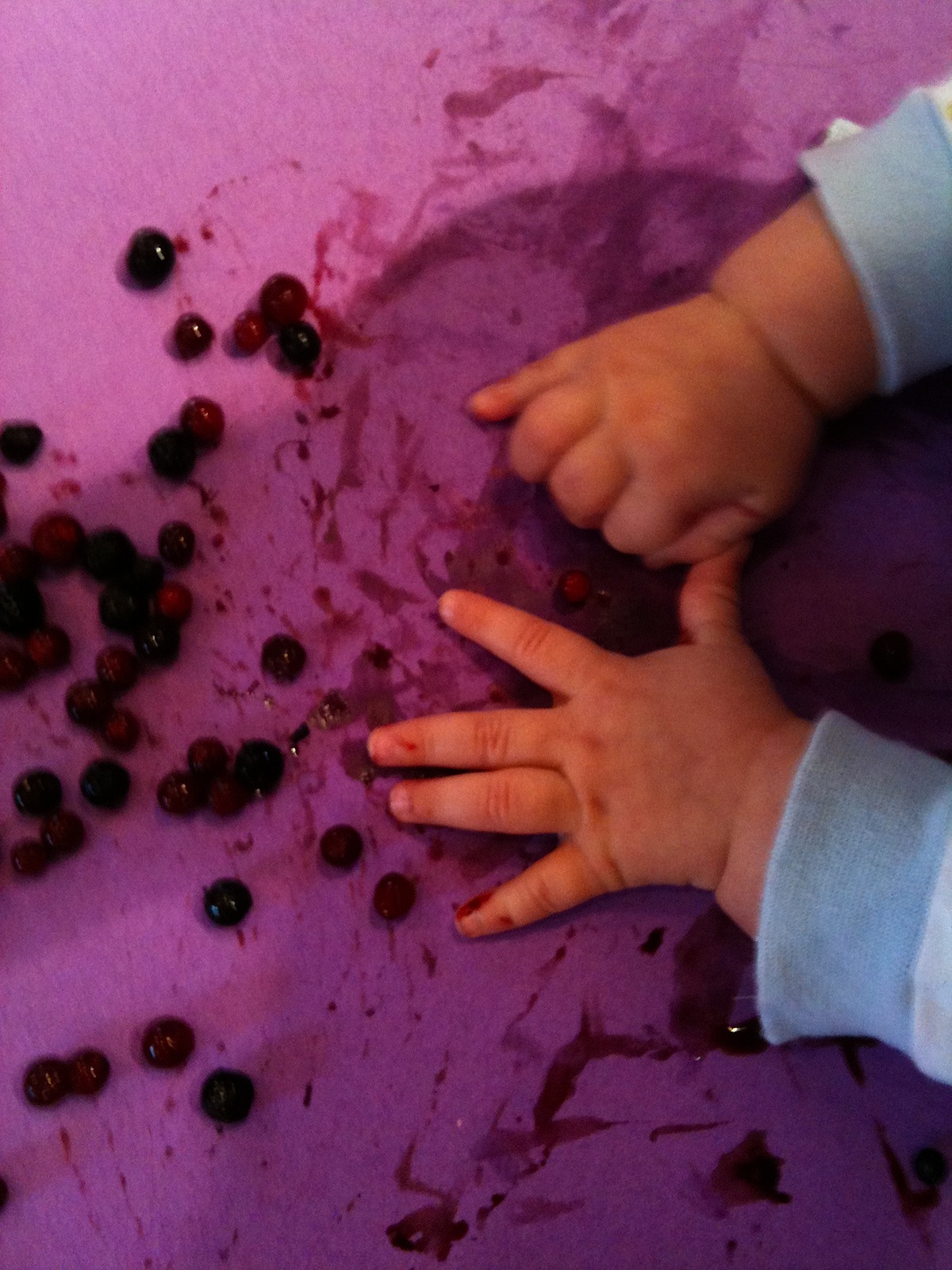 Silla went to the colour bath for the first time. They used frozen blueberries and lingonberries as material. And warm pudding (kissel? fool? dessert cream?). Furthermore, they painted with white paint. Obviously this wasn’t enough for Silla, since she also spat thrice on her oeuvre. It’s good to get a personal touch to the work.