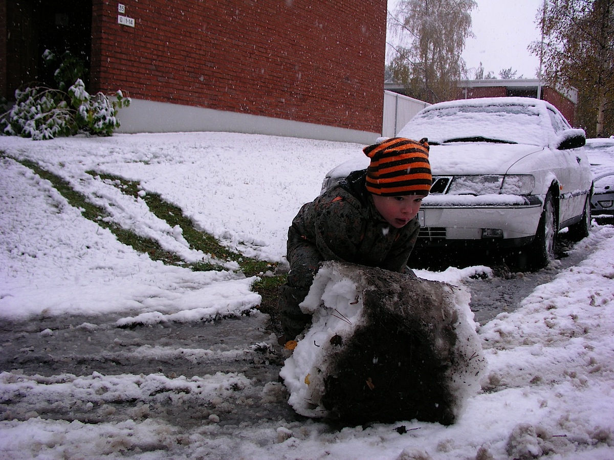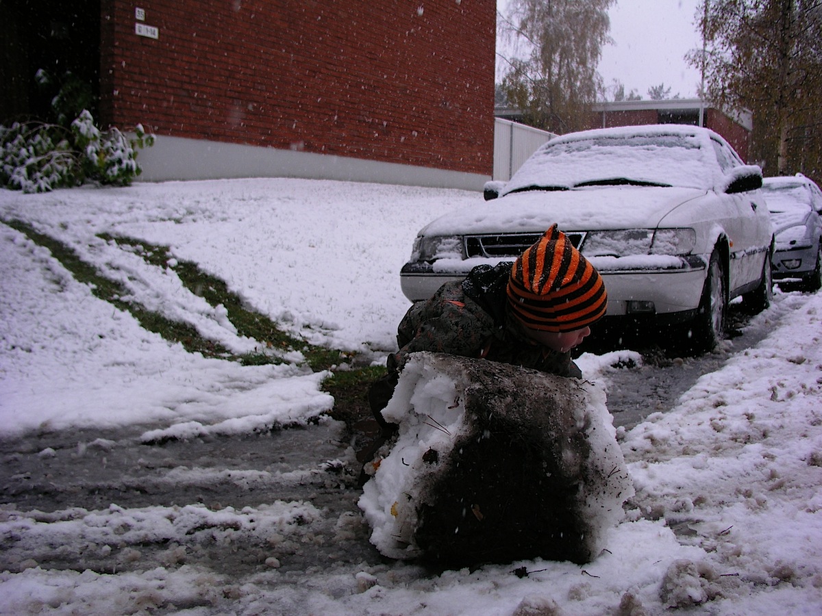 Last monday, plenty of heavy wet snow fell to the ground. The ground was covered rapidly, and equally rapidly Eeli felt the urge to go outside. After half finished breakfast, and without any water-proof clothes he got out. It was fantastic. First he shoveled the front yard, then the car. The snow on top of the grass was good for manufacture, so Eeli made a snow man. The snow man was so fragile that we didn’t even get a chance to take a photograph.