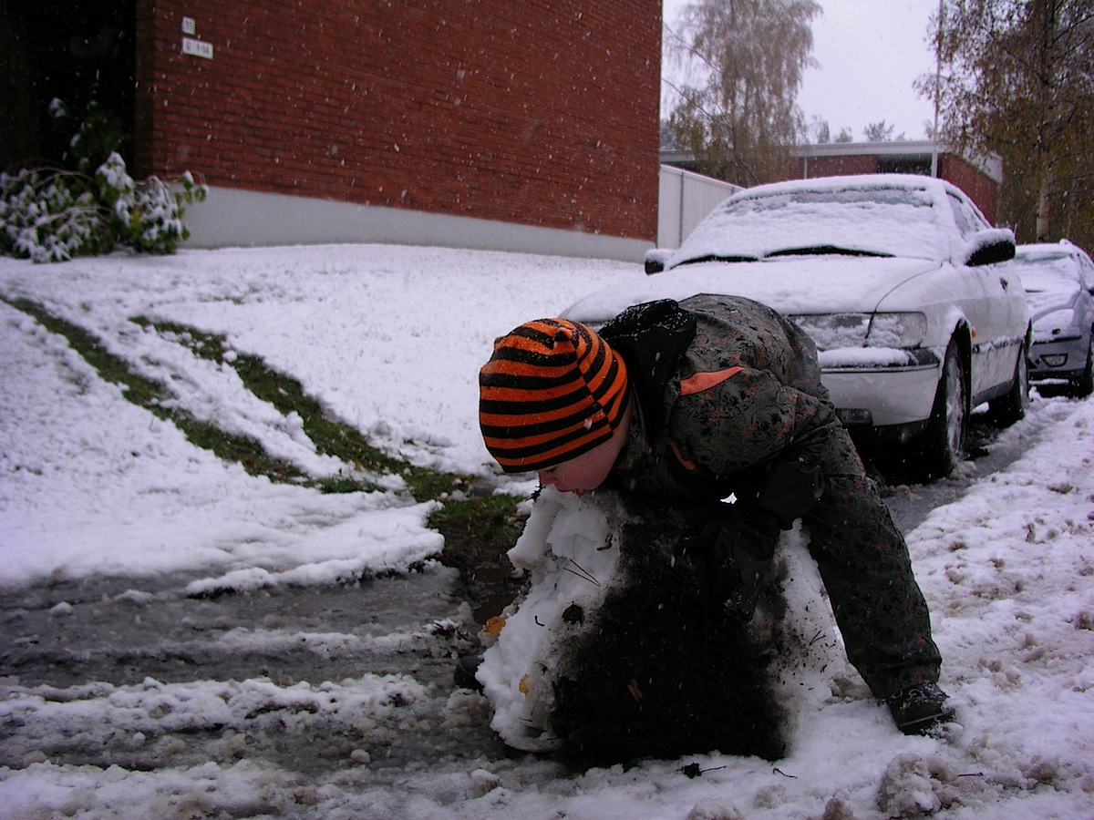 Viime maanantaina satoi taivaan täydeltä suuria märkiä hiutaleita. Maa peittyi nopeasti ja vähintään yhtä nopeasti oli Eelin päästävä ulos. Aamupala puoliksi syötynä, vedenpitäviä vaatteita vailla hän lähti. Riemu oli mitä suurin. Ensin lapioitiin kotioven edusta, sitten auto. Nurmikolla oli lunta niin, että siitä pystyi pyörittämään suuria palloja. Niinpä meidän takapihallemme syntyi talven ensimmäinen lumiukko, joka tosin oli niin kiikkerä, ettei siitä pystyssä ehditty ottaa edes kuvaa.