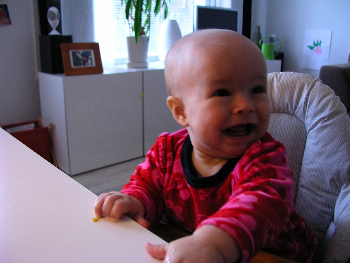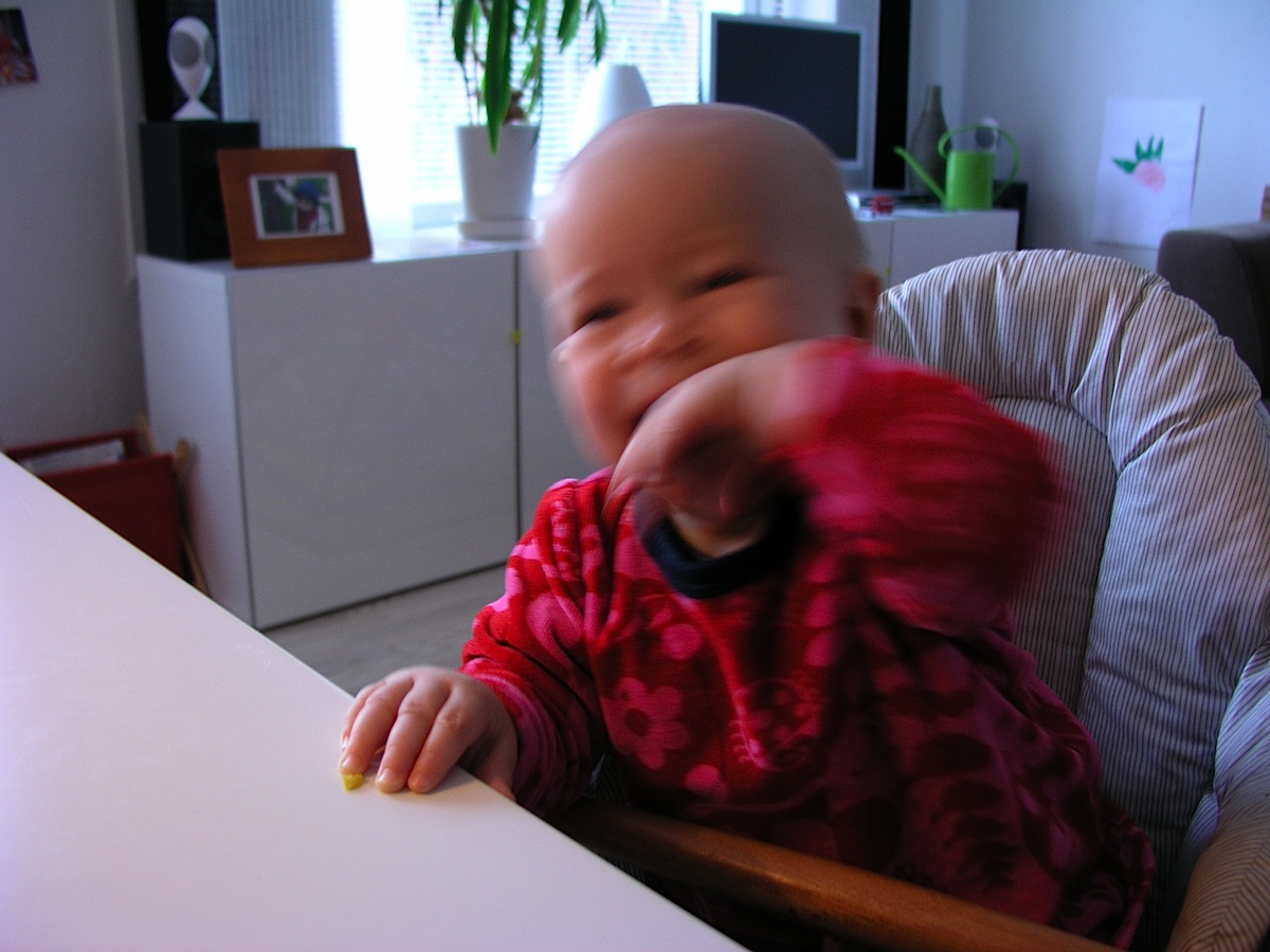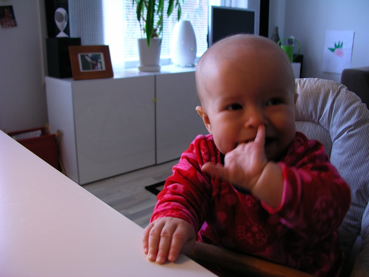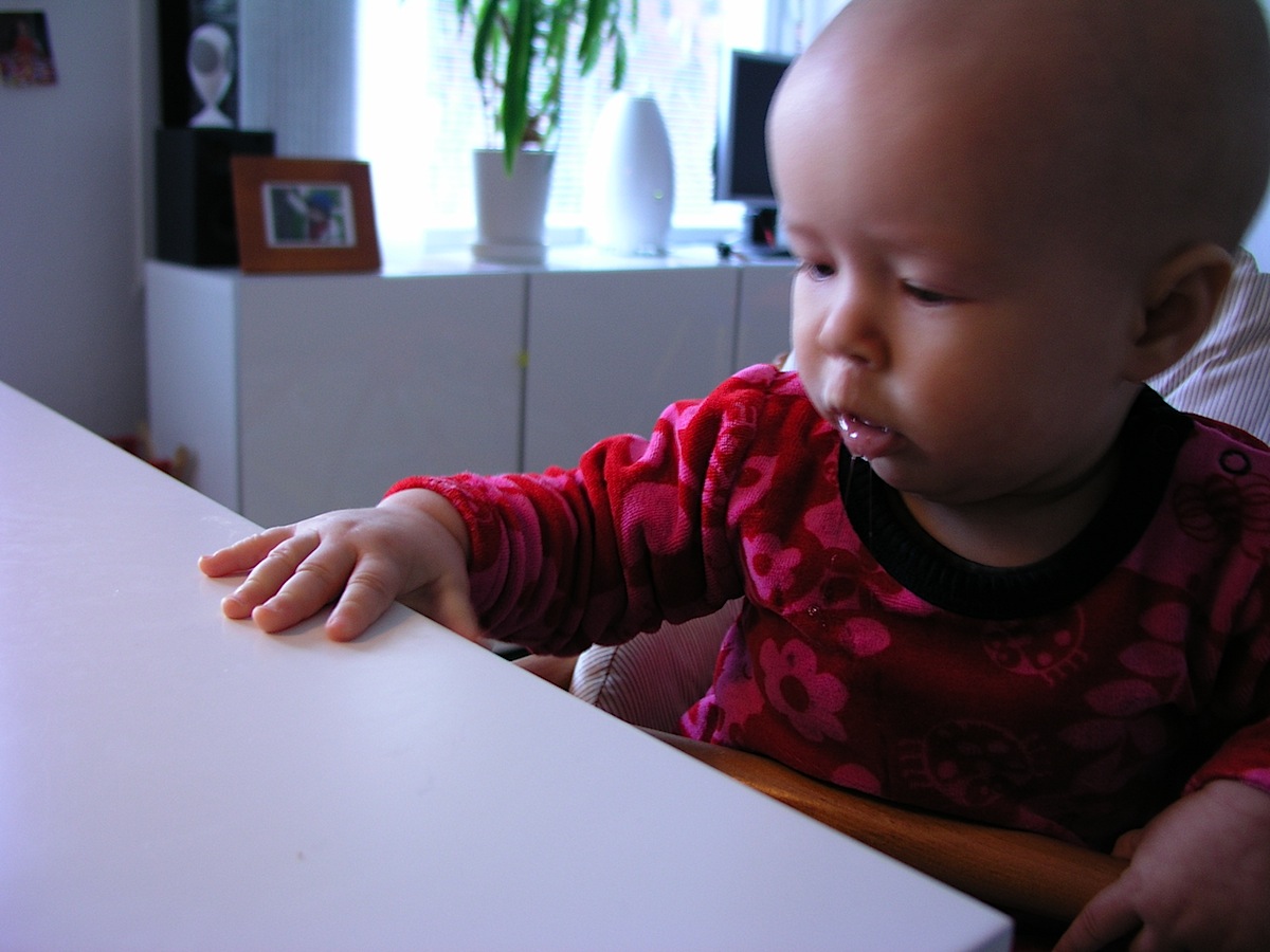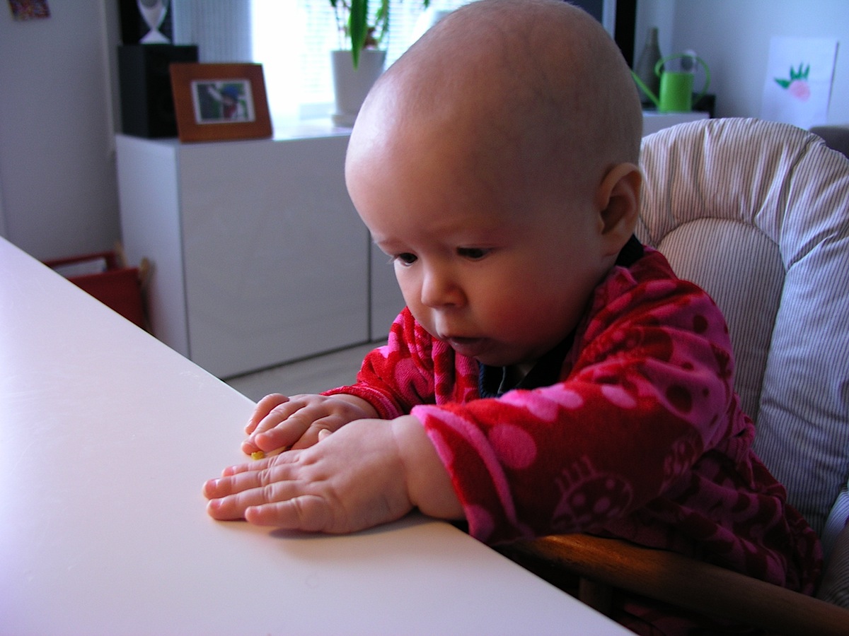 Silla harjoittelee pinsettiotetta. Ote ei vielä ole kovin tarkka, mutta kehittynee pikaisesti, koska tällä hetkellä kiinnostaa pesulappuja pienemmät asiat. Esimerkiksi leivänmurut, riisi, kuivat pensaan lehdet, mitä puskee ulkoa sisälle joka kerta kun ulko-oven aukaisee. Tiedättehän.