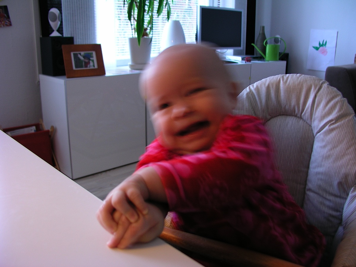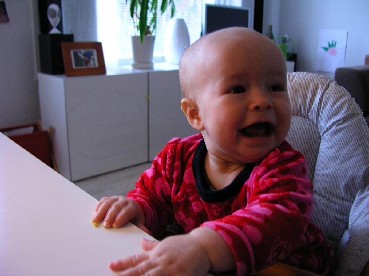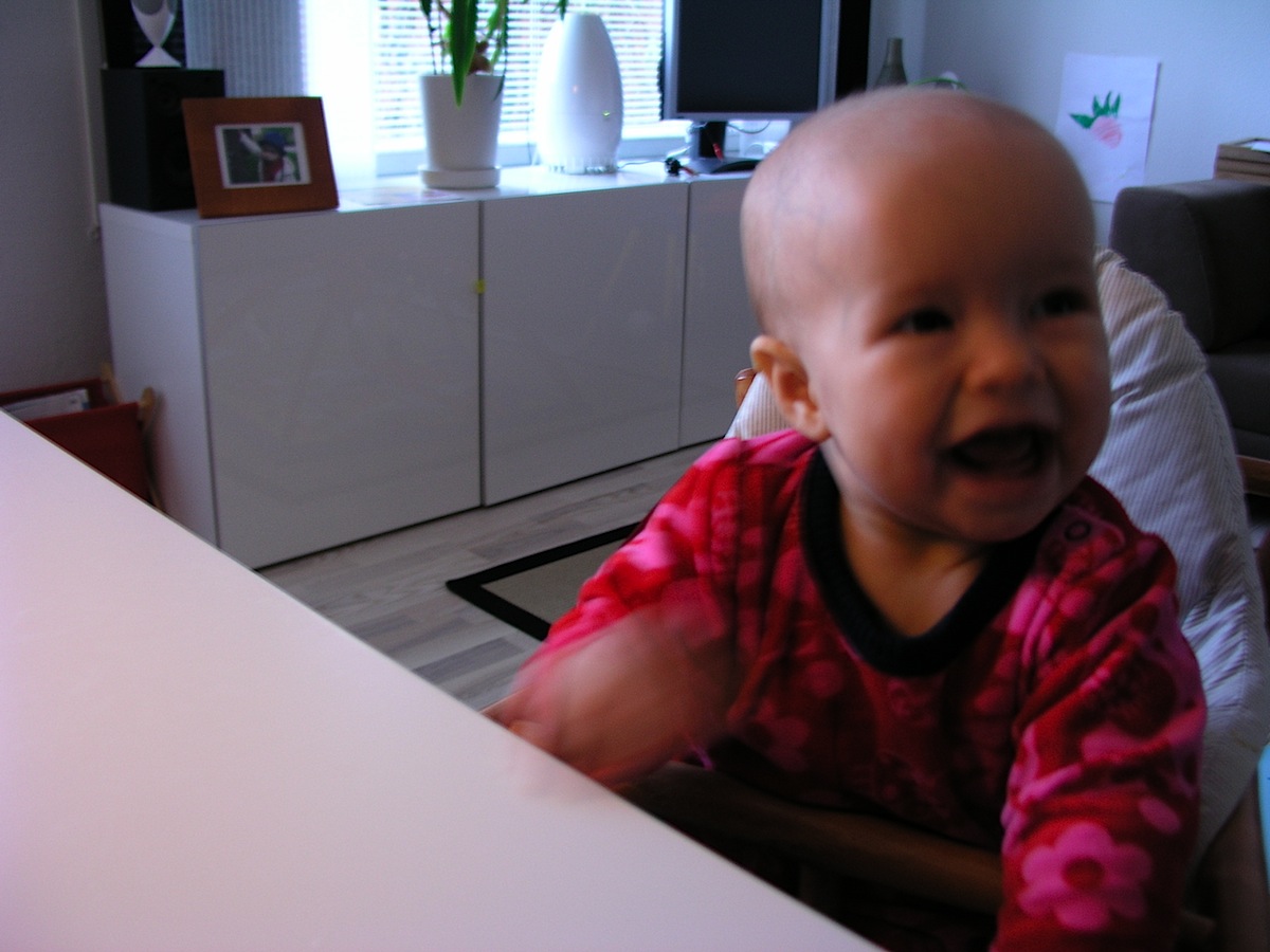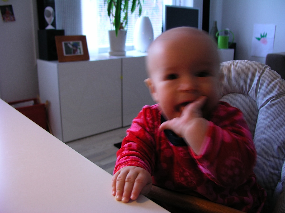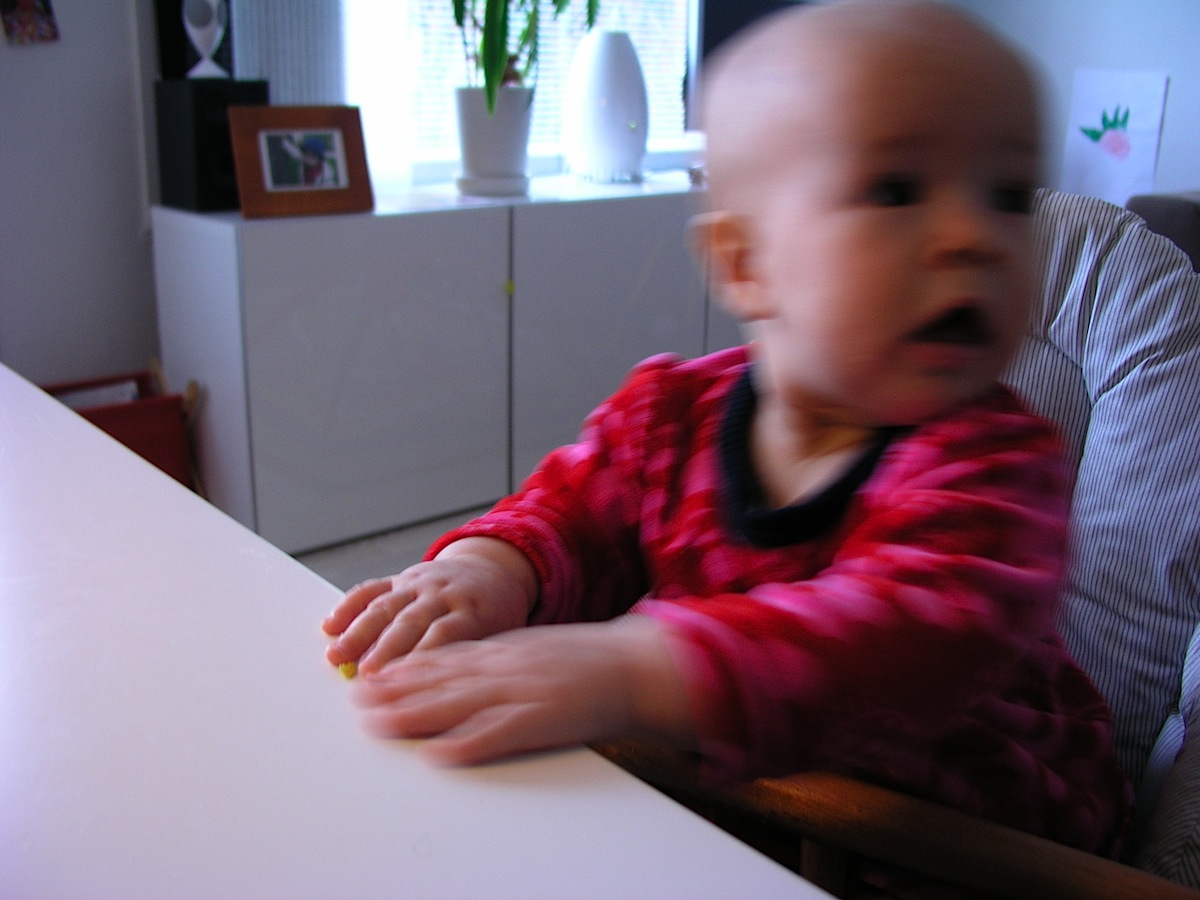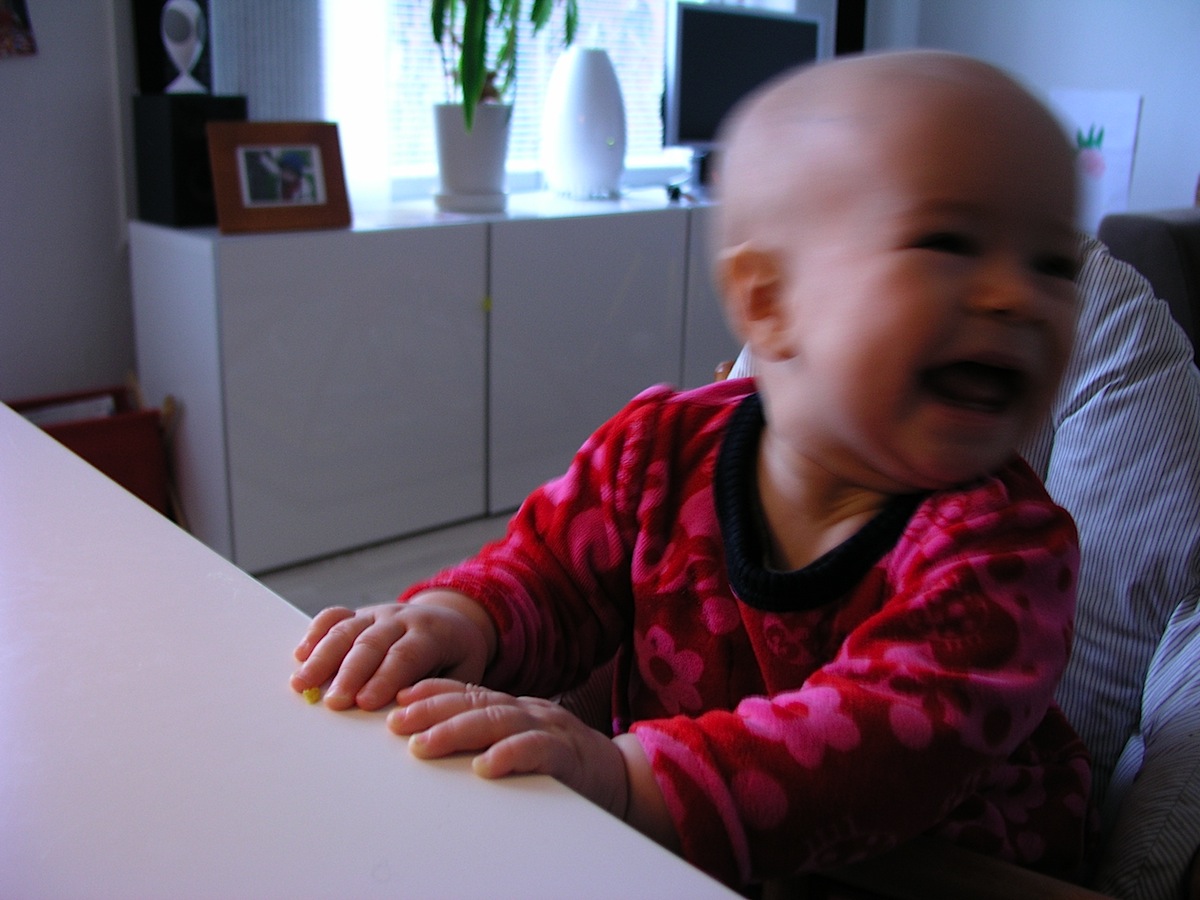 Silla harjoittelee pinsettiotetta. Ote ei vielä ole kovin tarkka, mutta kehittynee pikaisesti, koska tällä hetkellä kiinnostaa pesulappuja pienemmät asiat. Esimerkiksi leivänmurut, riisi, kuivat pensaan lehdet, mitä puskee ulkoa sisälle joka kerta kun ulko-oven aukaisee. Tiedättehän.