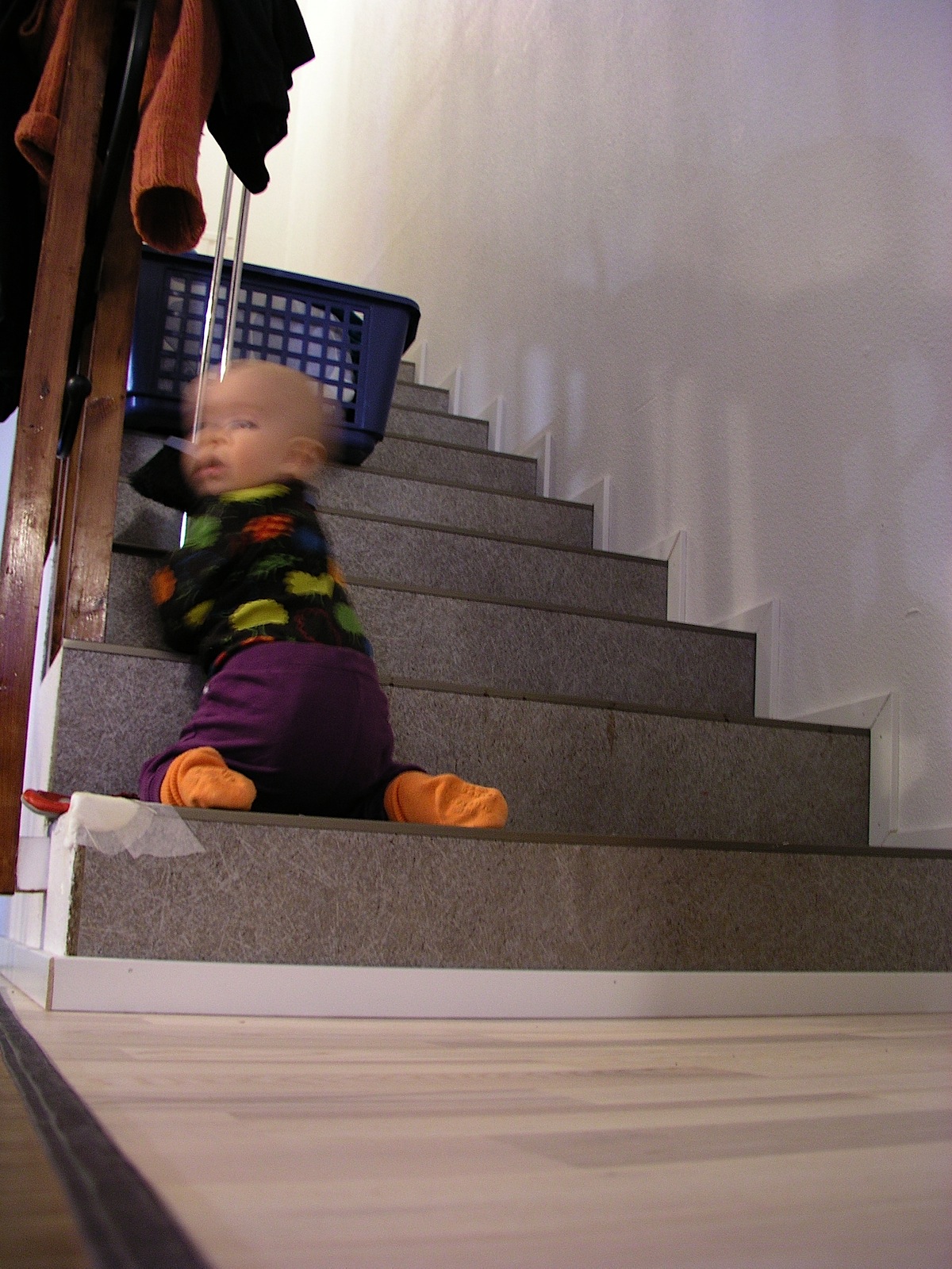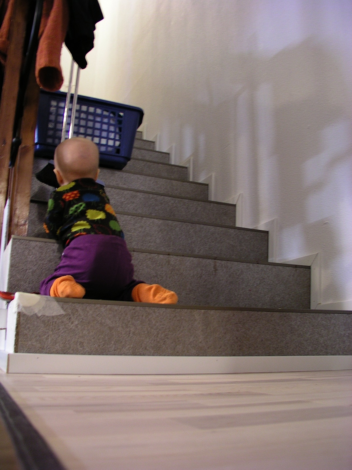 I think that dustpan is a very interesting object. I like to fiddle with the bristles and eat dust. Mommy has moved the dustpan to the third upstairs step so that I could not reach it. Heh, heh. I can climb!