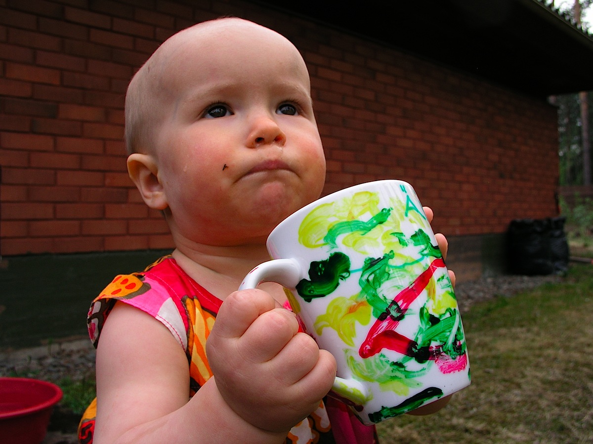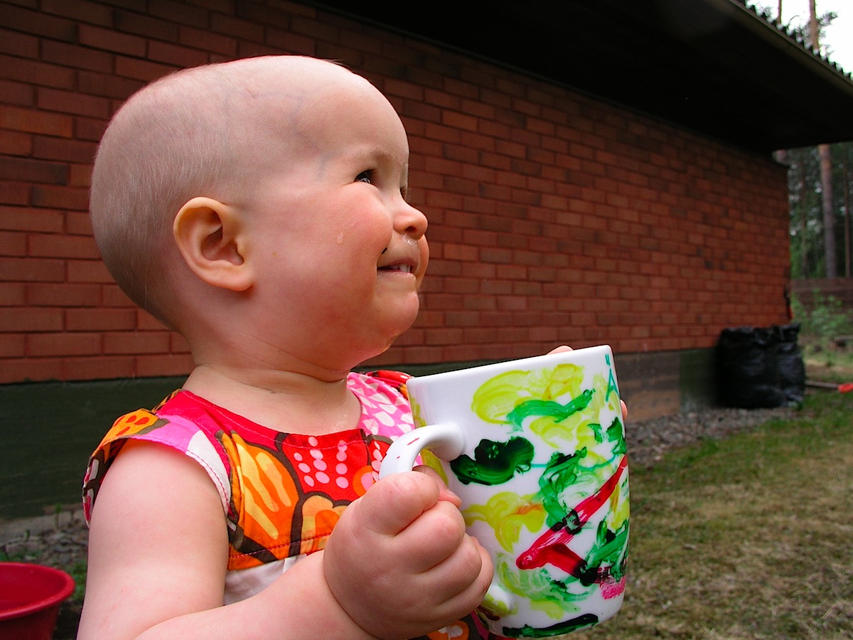 Silla is approaching 14 months. She has started to show signs of her own will. She’s loud (a lot like the mole characters) when things don’t go as planned. She loves to put things on (she masters hats and attempts shoes, shirts and socks). She understands quite a bit already. She can take the sock to daddy, put the spoon into the drawer, close the door. She eats and drinks stuff that Eeli still is not able to handle: pickels, oranges, beats. sparkling water and coffee… It seems that she has developed somewhat of a caffeine addiction already (see above).