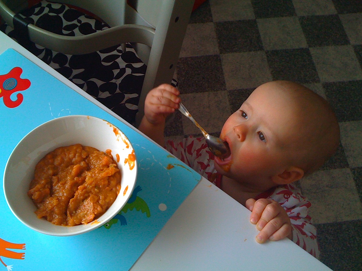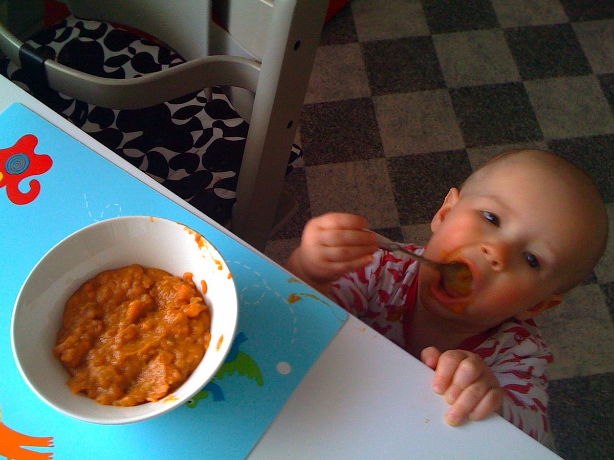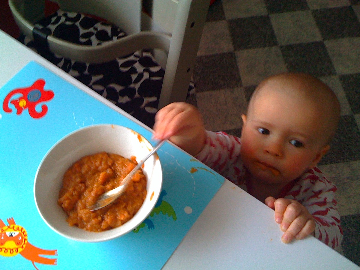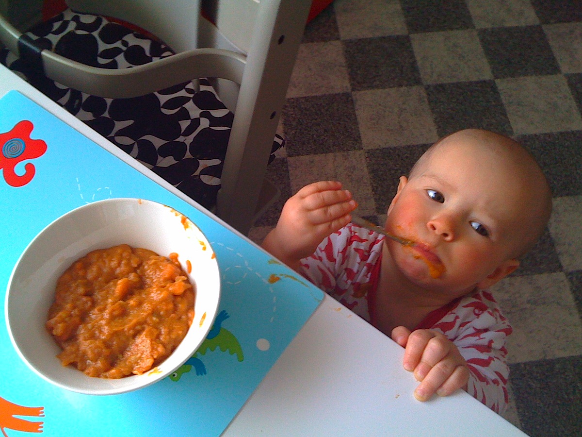 Sometimes this is what happens when the food is put on the table to cool down and mommy goes away for a second. Both of our kids are very self-motivated. And have a good reach.