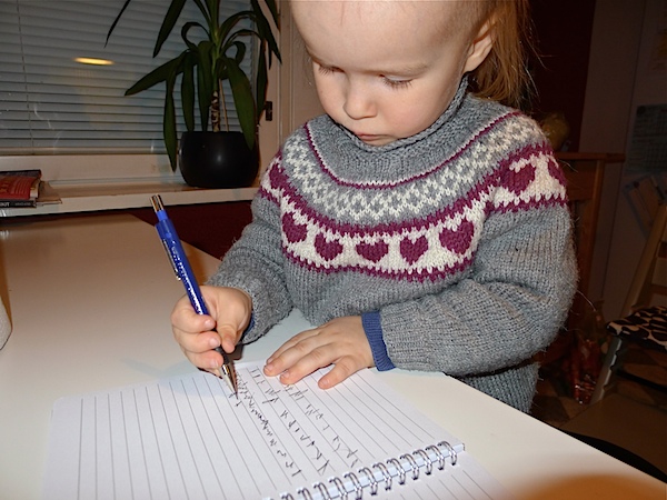 Eeli tekee nykyisin läksyjä eli kirjoittaa vihkoon. Minäkin osaan! Eeli has homework these days which means he writes in his work books. I can do that, too!