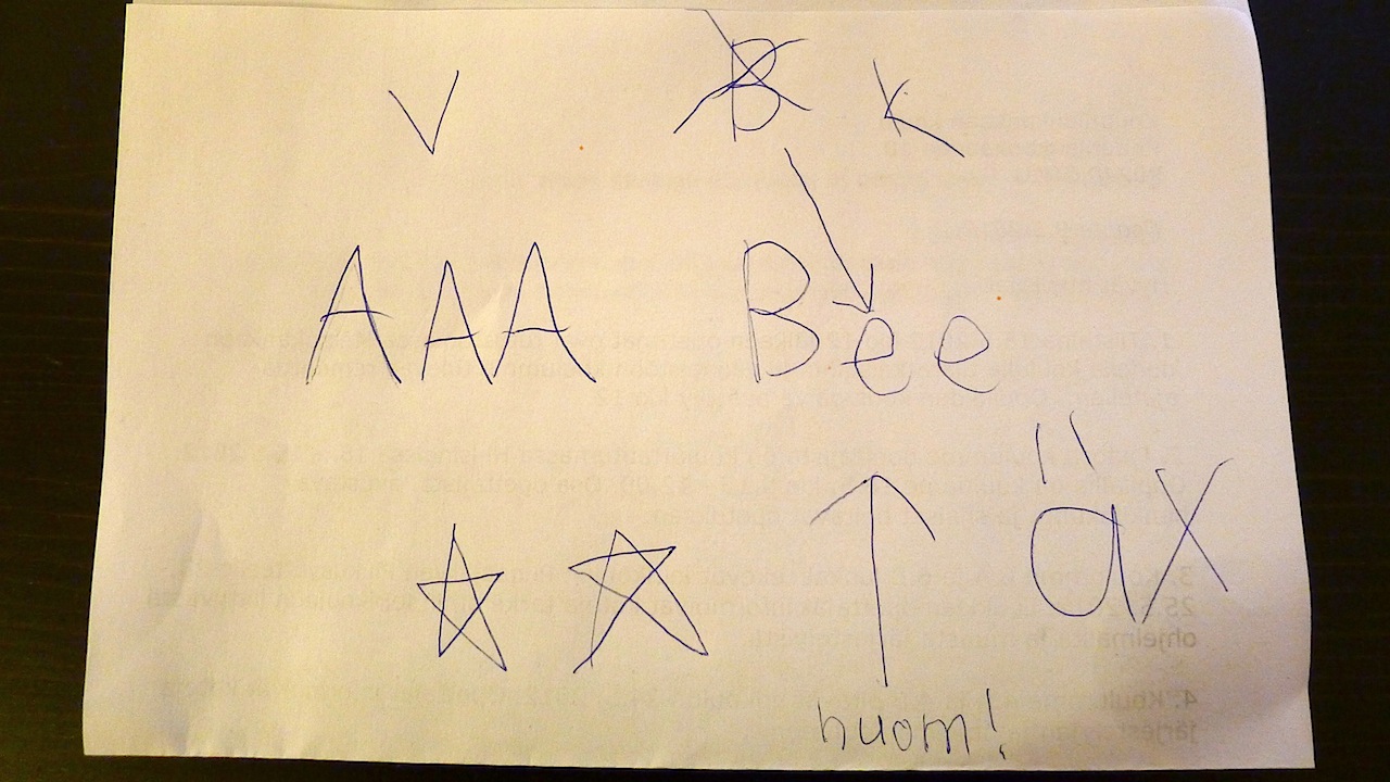Silla kirjoitti nimensä iskän kirjoittaman mallin mukaan, ensin iskän kirjaimien päälle ja sitten ihan itse. Neiti kommentoi, että ”mulla tuli hahhu ähhä”. Aiemmin tässä blogissa kerrottiin, kun Eeli kirjoitti nimensä tauluun samanikäisenä. Silla wrote her […]