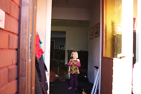 Tähhä on minä. Minä ulkoilemahha. Edit: Myöhemmin äitille kerrottaan että: ”Tuohha mää oon huikuttamahha sjulle kun sää oot menohha töihin. Hikki mää oon nottanut käden tollai ylöt.”