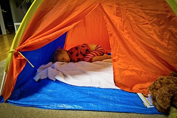 Silla on yöpynyt kohta pari viikkoa teltassa. Illalla poltetaan teltan edessä (takassa) nuotiota, sitten luetaan Tuhkimo iltasaduksi (joka ilta). Sitten nukutaan sikeästi aamuun asti.