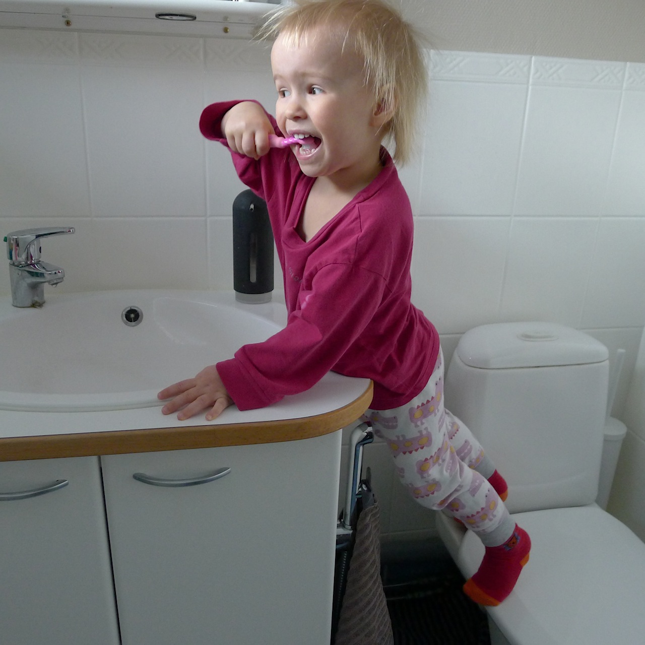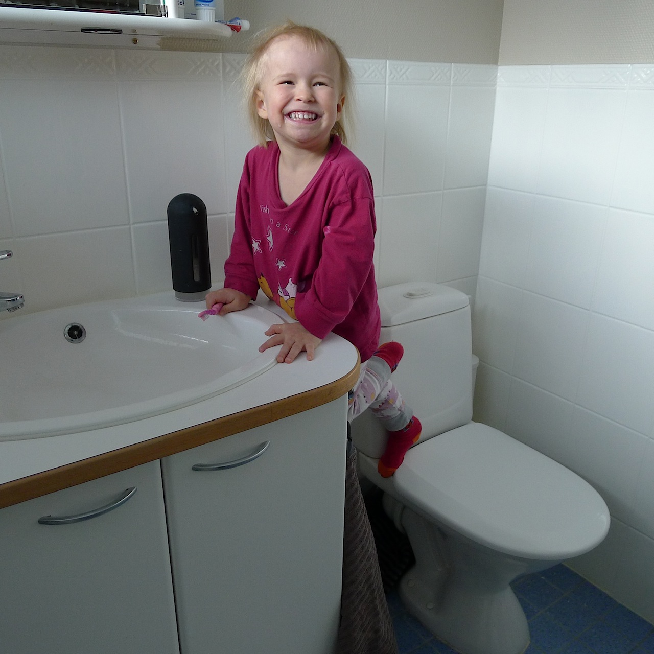 ”Ei oo mittään hättää, ikkä. Laita vaan pää tänne lavuaahiin ja hitten hyykähe! Kato näin!”