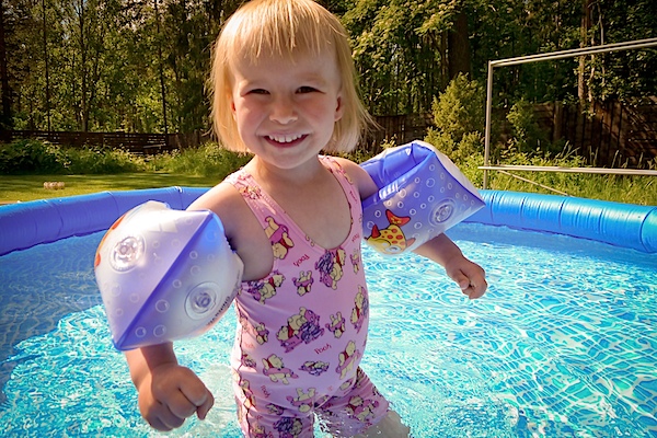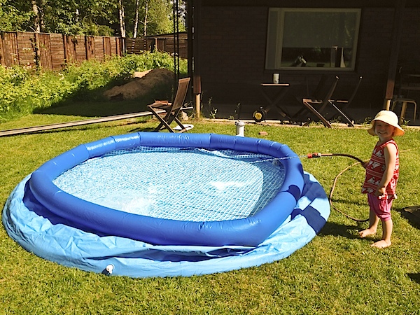 Mummu ja pappa lahjoitti meille uima-altaan. Helteisen juhannuspäivän kunniaksi täytimme sen jääkylmällä vedellä. Aurinko ei ehtinyt vielä tälle päivälle vettä lämmittää. Se ei kuitenkaan pysäyttänyt nuorisoa. (Video kannattaa kyllä katsoa, sisältää yllätysmomentin)