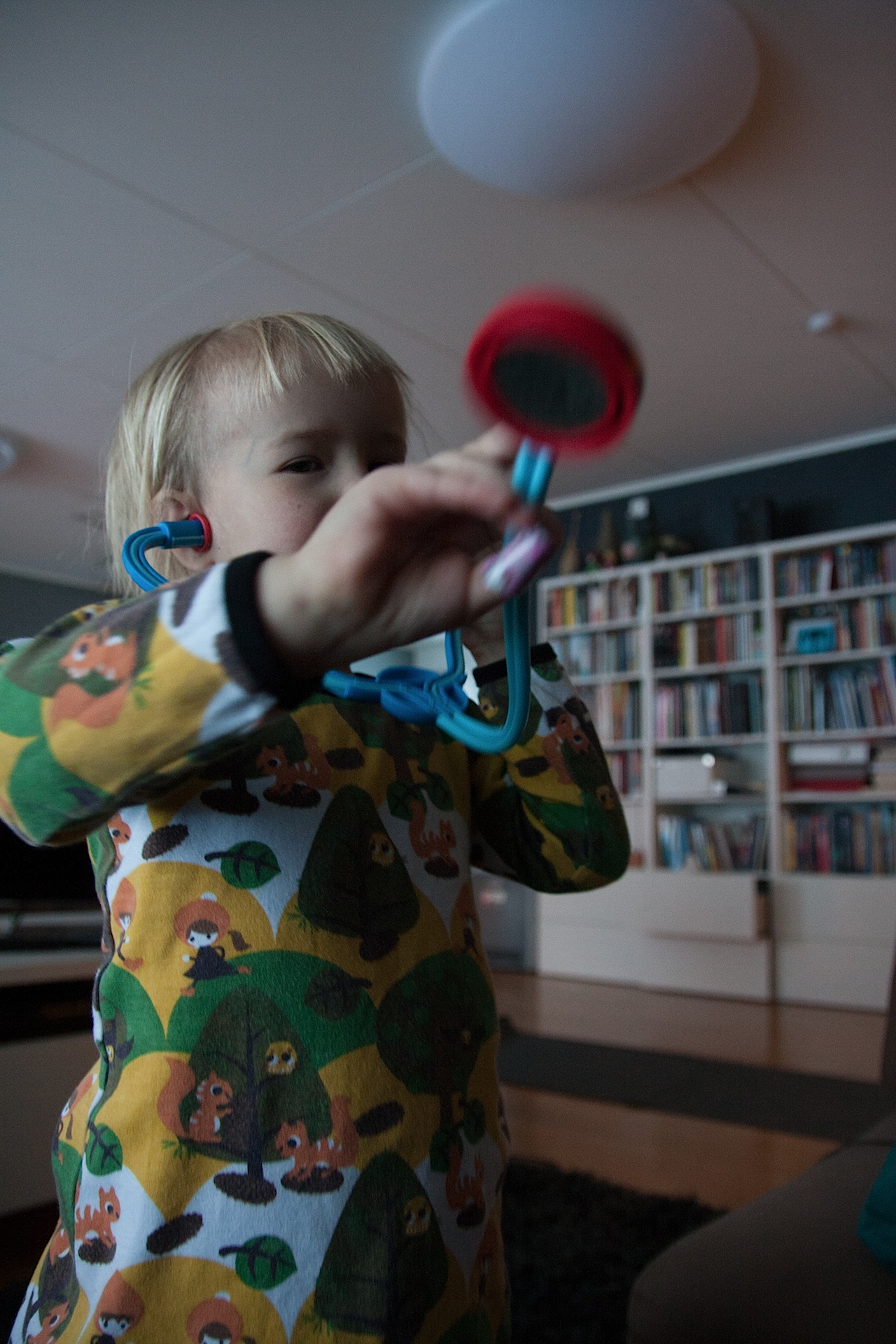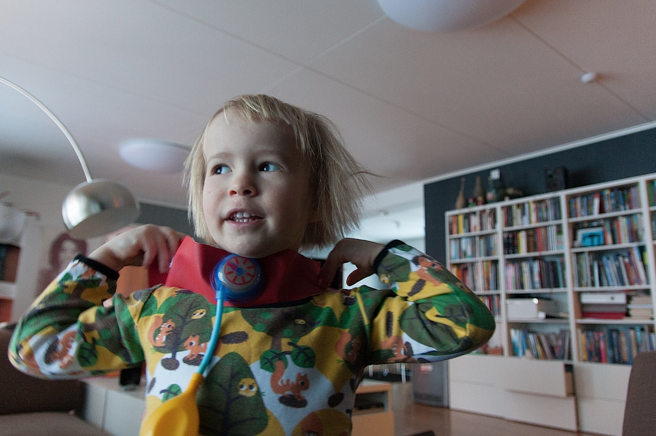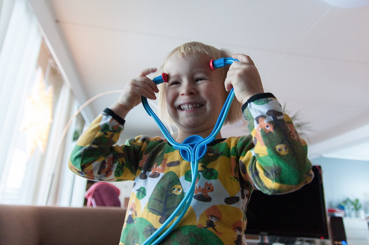 Itse tutkimus oli kyllä tarkka. ”Verentulomittarilla” ranteesta mittaamalla selvisi, että sormessa on haava ja siihen pitäisi laittaa laastari. Korvalamppu asetettiin korvaan ja sinne huudettiin täysillä ”PÖÖ!” Sitten tutkittiin ”sydäntulehduksella” (eli stetoskoopilla) napaa ja päätettiin, että olisi syytä syödä vähemmän nuudeleita. Kuumemittari asetettiin paidan alle rintakehän kohdille alle sekunniksi ja mittarista luettiin että (”sjeittemänkymmentä-pilkku-viis, kyllä on paha mieli”). Lopuksi annettiin rokotus keskelle otsaa. Kyllä sje paranee.