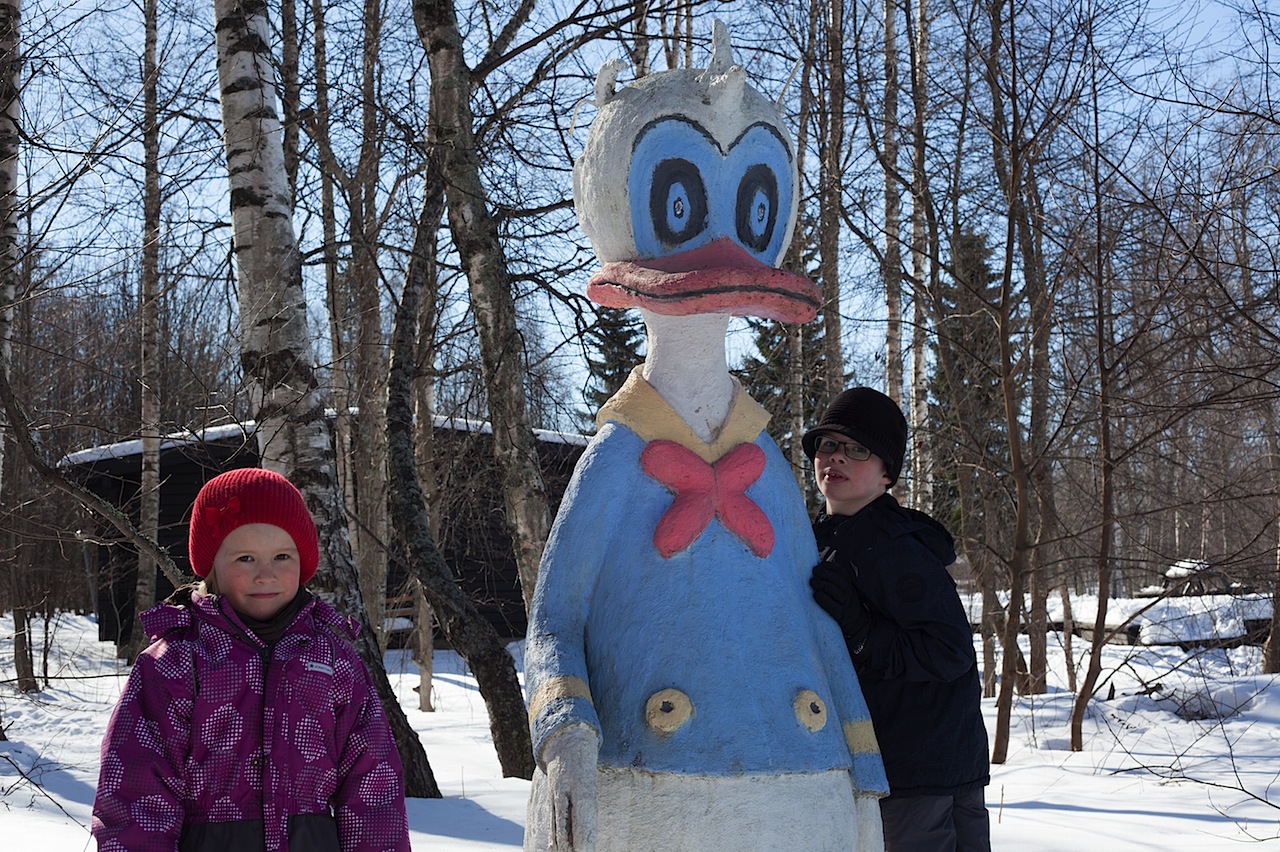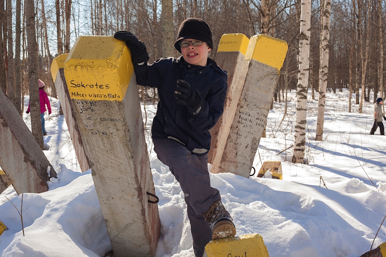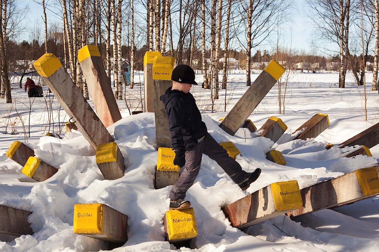 Muutama viikko sitten käytiin joen toisella puolella Saarelan veistospuistossa katselemassa veistoksia. Siellä oli tosi outoja ja vähän pelottaviakin juttuja. Mutta hauska oli tämä suurmies-betoni-systeemi. Meidän oma suurmies kiipesi 90 asteen kulmaan Sokrateen päälle niin, että iskän piti kiivetä noutamaan hänet pois.