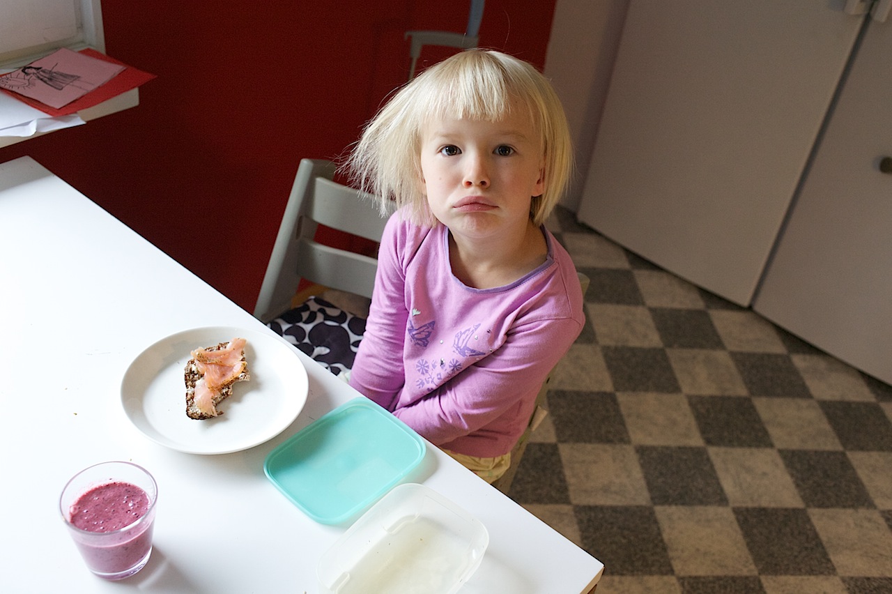Meillä on aikaisemmin saanut melko rauhassa herkutella graavilohella. On voinut syödä nautiskellen ja säästää herkkua usealle päivälle. Eeli ei ole suolakalaan koskenut, Teemu on ottanut ehkä kaksi siivua ensimmäisenä päivänä. Mutta. Nyt on äitillä kilpailija ja suolakalan syömisessä on näinä päivinä kyse a) piilottelusta ja b) nopeudesta. Näin käy kun aamupalalla tarjoaa lapselle suolakalaleivän: Se lastaa kalat leivälle ja syö loput kalat rasiasta (leipä tässä vaiheessa vielä koskematon)!